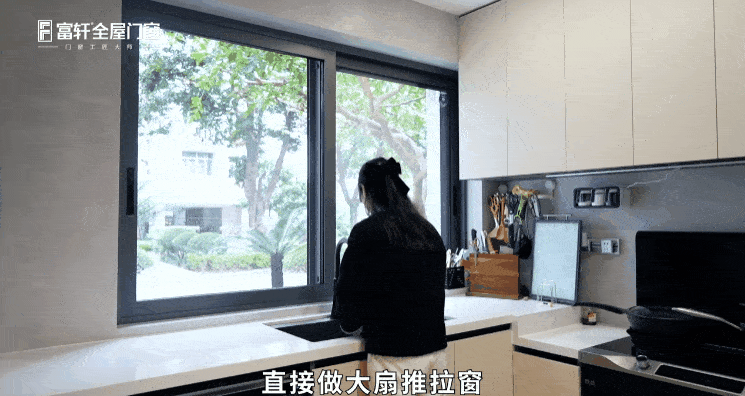 廚房采用開放式設計,簡化住宅內部的結構和裝飾,融合用餐區和日常生活空間的邊界,給予空間無限想象。在廚房水槽位選擇用極簡推拉窗,推拉順暢,簡約大氣。打開窗戶可以及時做到排風透氣,減少廚房內的油煙灰塵,守護家人的健康人居生活。