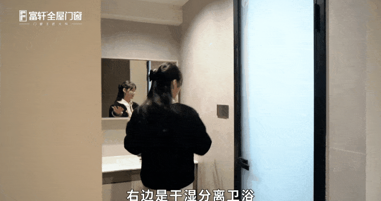 衛生間門采用富軒全屋門窗極窄平開門,外觀優雅極簡。采用瓦楞玻璃設計,玻璃材質+特別的紋理工藝,完美呈現出玻璃獨特的透光性和隱私性兩者的絕佳融合,滿足業主的人居體驗。