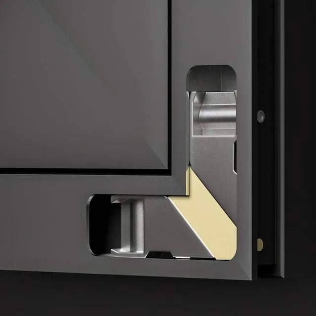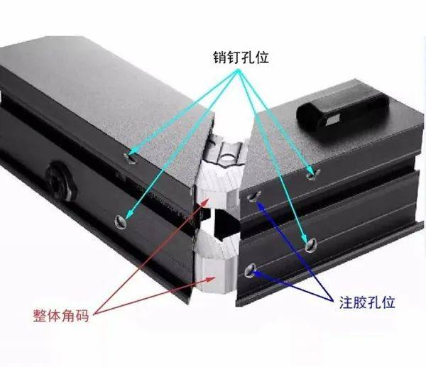 系統門窗的組角連接采用的是專用的鑄鋁角碼配以空心不銹鋼銷釘+注膠,這種組角工藝包含了兩項特殊技術:一是膨脹拉緊固定技術,二是注膠密封技術,使得角碼與型材腔體之間的縫隙也完全封死了,保證系統門窗擁有良好的氣密性。