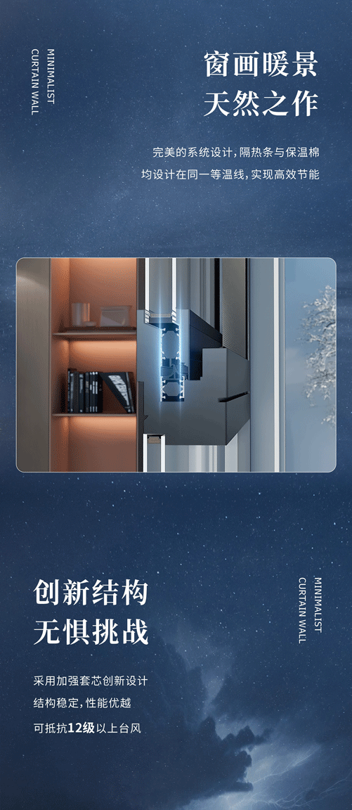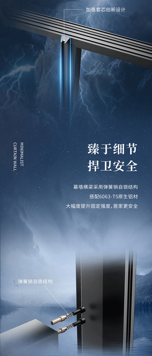 【玻璃配置】:6mm+15A+6mm 【水密性能】:6級 【氣密性能】:8級 【抗風壓能】:9級(最高級) 【保溫能】:K≤2.5(W/㎡·K)(Low-e中空玻璃) 【隔聲性能】:36db